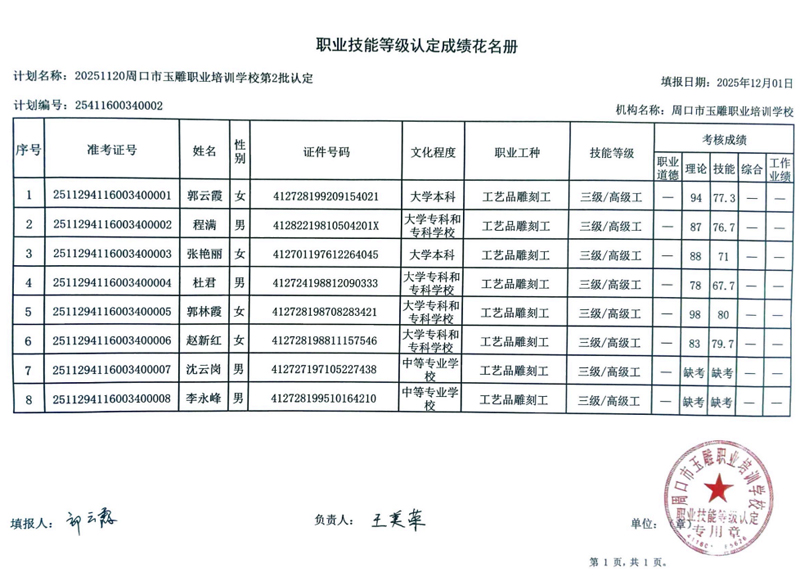 周口市玉雕职业培训学校2025年1-2批社评组织职业技能等级认定考试成绩公示
